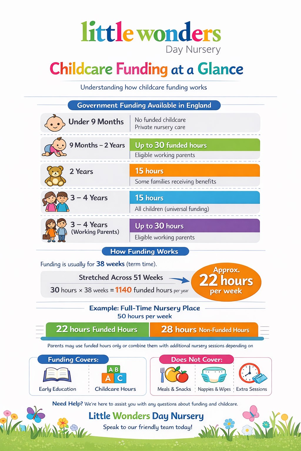At Little Wonders Day Nursery, we stretch these hours across 51 weeks to help families access childcare more consistently.